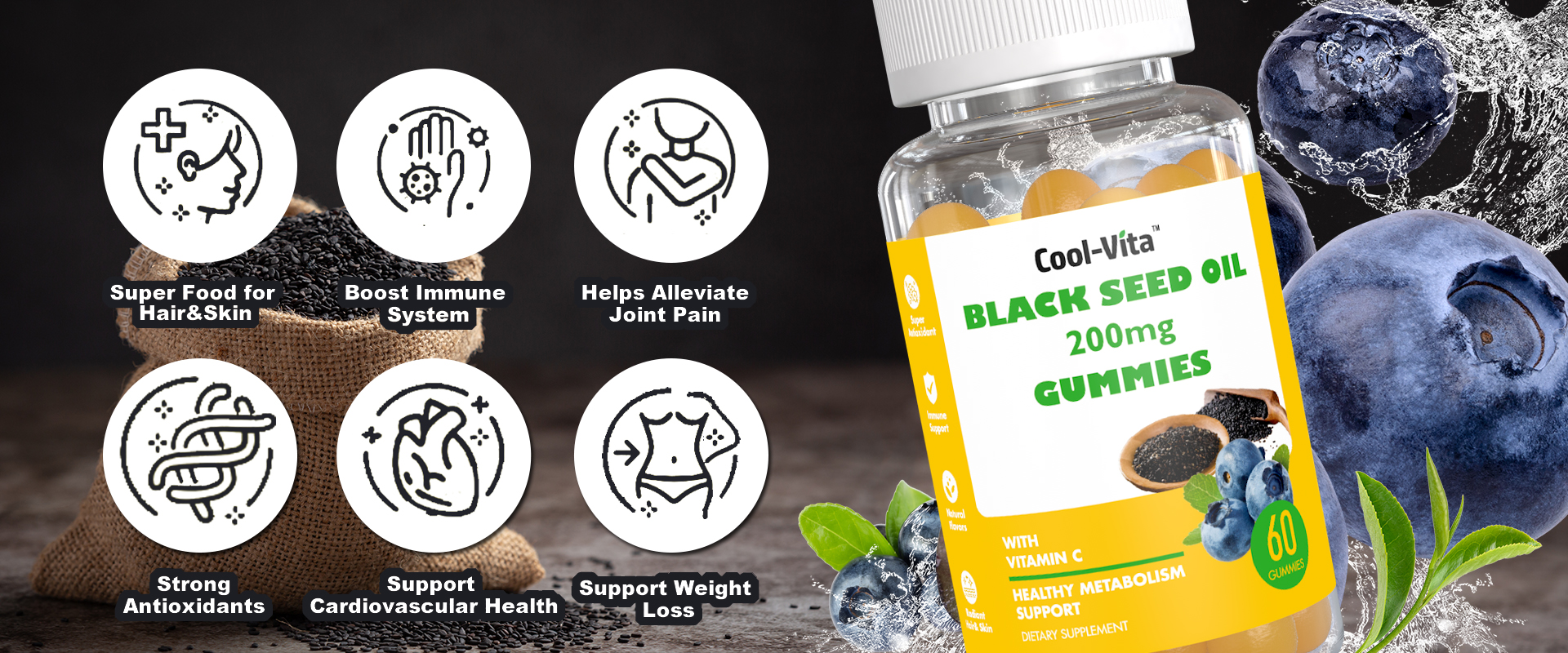Black Seed Oil 200mg Turmeric Powder 20mg Pomegranate Powder 200mcg VC 60mg |