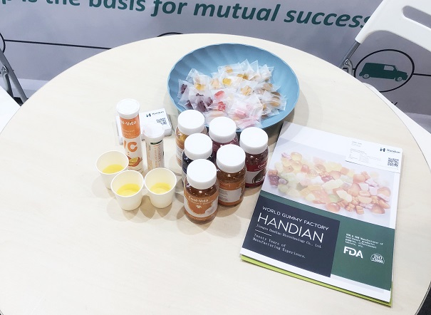 汉典的展品有可爱的小熊软糖、软萌的爱心软糖、晶莹透光的圆形软糖、缤纷果味的泡腾片…高颜值展品一下成为吸引专业客户的法宝。汉典为美西植提展的专业客户提供了便携独立的小样,了解产品的同时,让客户补充一下每日所需营养。